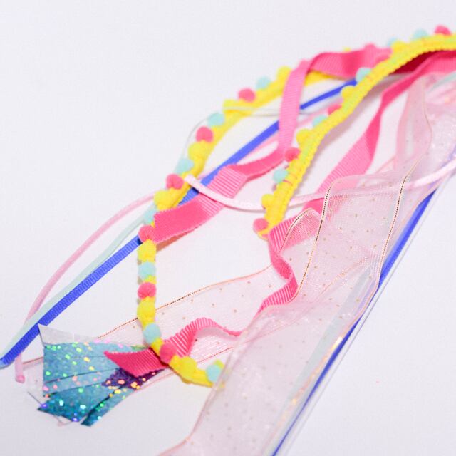リボン(コットン、レーヨン、本革などMIX)、棒(アクリル)、ミラーテープ、ウッドビーズ、鈴